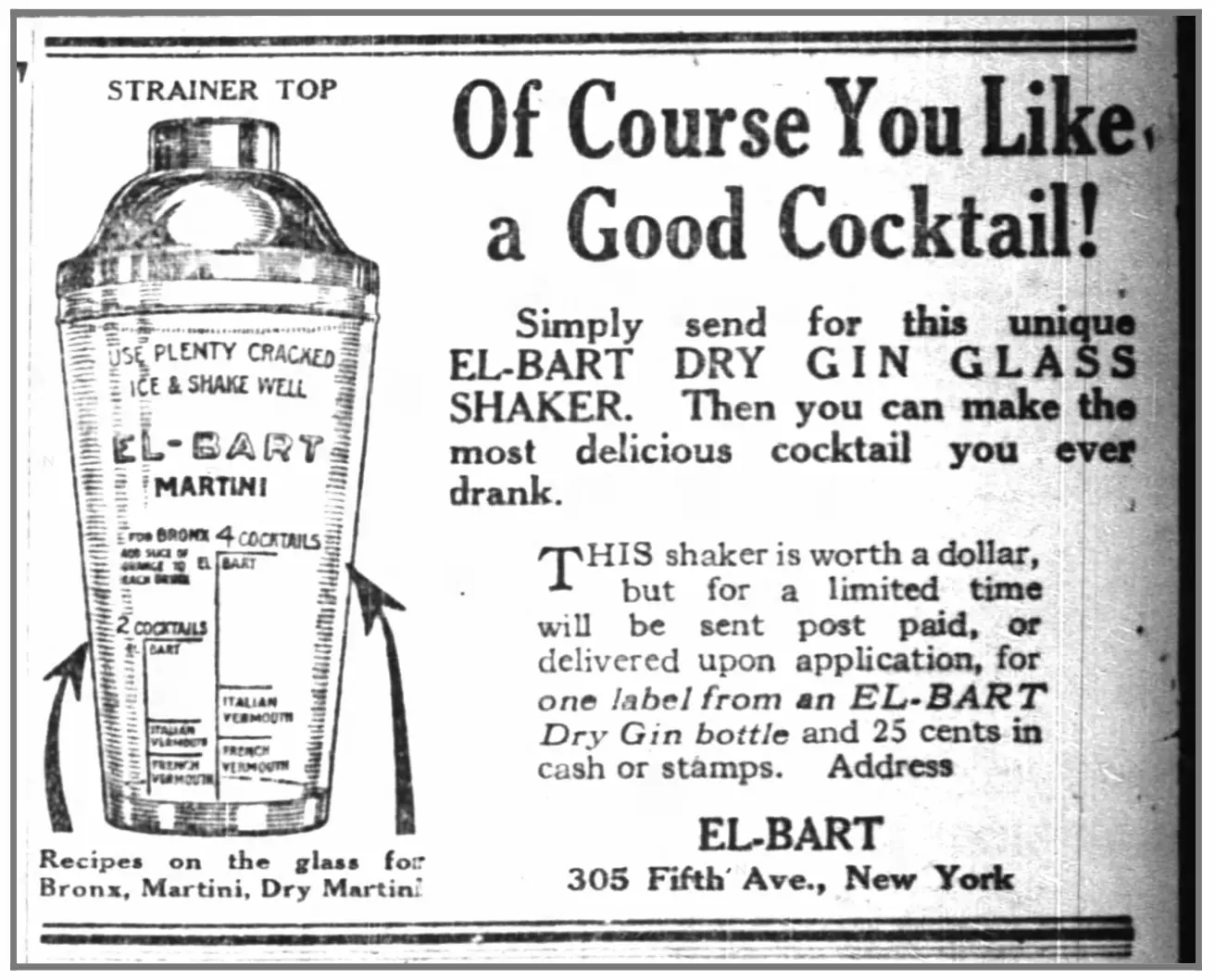 Die erste Werbung für einen El Bart Gin erscheint 1905 in New York. Sein Logo erinnerte an einen nautischen Wimpel. Damals wurde ein El Bart Gin jedoch von einer amerikanischen Destillerie hergestellt, der Wilson Distilling Company aus Baltimore, gegründet im Dezember 1898.